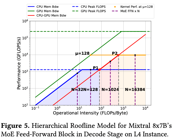 上文中的 roofline 描述的是在统一计算平台中的性能,而推理框架考虑到成本因素,往往会有异构平台,这需要新的 roofline model 来描述该平台性能。 MoE-Lightning 提出了 HRM 来描述异构平台的计算性能。与普通 roofline 不同的是,该模型的 roof 由多个 memory roof 和 compute roof 组成,根据实际情况选择具体的区域,具体的推导过程见原文。